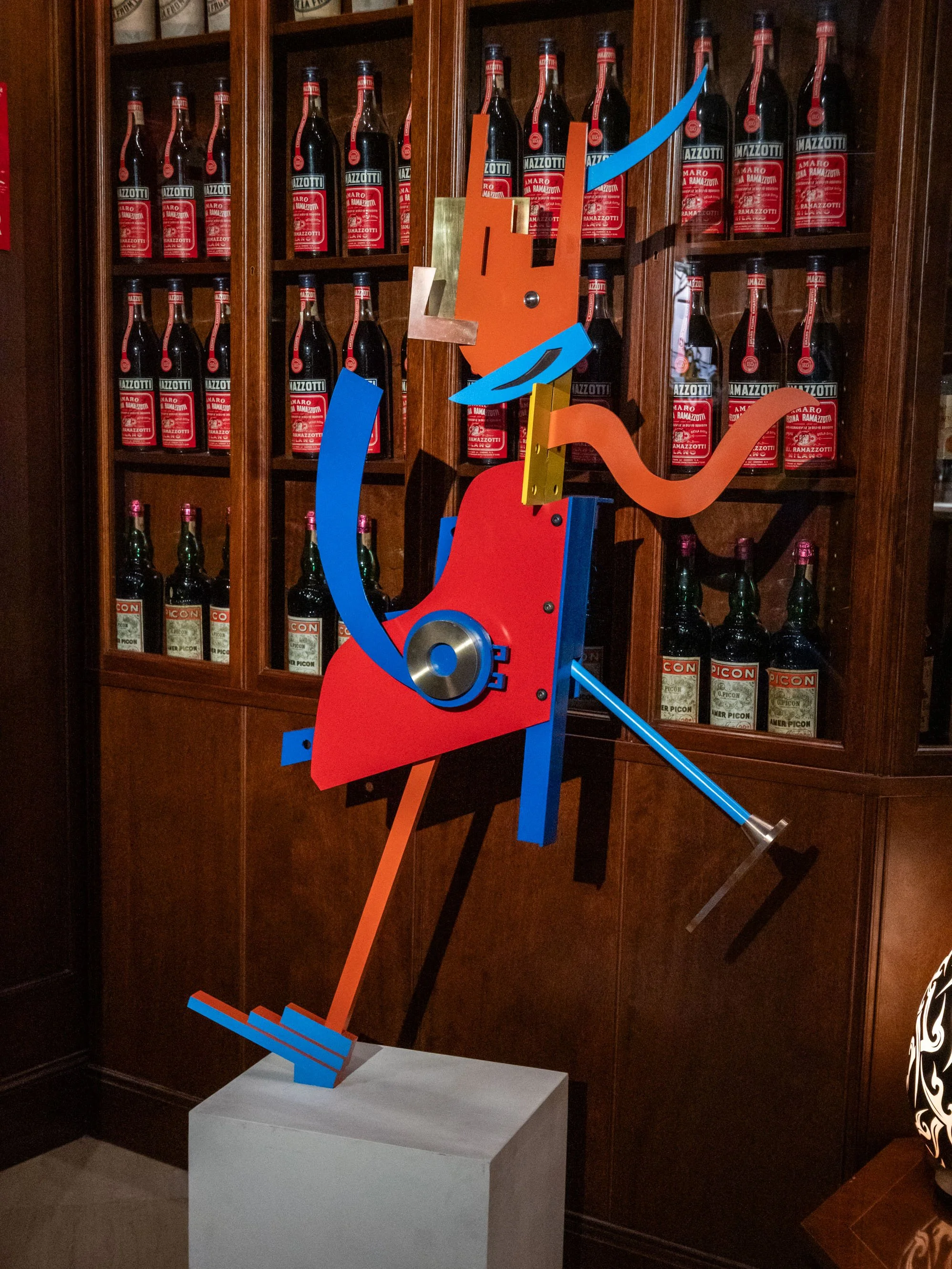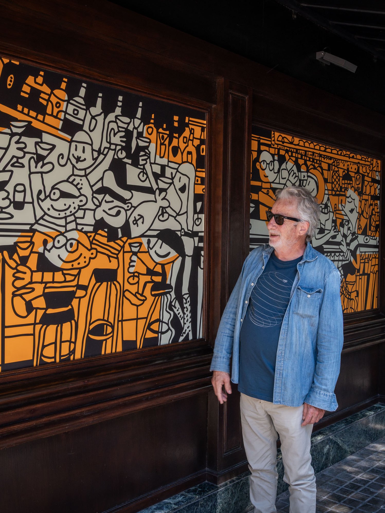 Barcelona's iconic Dry Martini bar is hosting an exhibition featuring a selection of works by Javier Mariscal, integrated into the cocktail bar's interior.